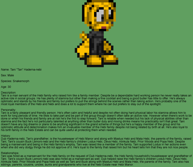 Bottom-right is Tani Haderna-nebi https://inkbunny.net/submissionview.php?id=1305416 Also not a blood relative of the Hebi family but raised alongside the Hebi family's children as a family member due to Dub Haderna-nebi's request, Dub being the Hebi family home's housekeeper, long-term family friend of the Hebi's and the grandfather of Tan. Tan is a very secretive member of the Hebi family household and little is known about him.