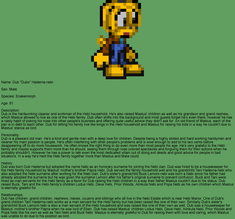 Top-center is Dub Haderna-nebi https://inkbunny.net/submissionview.php?id=1305359 Dubs is the housekeeper of Hebi Manor and helped raise the Hebi family's children in a fatherly way since Mastus had to remain aloof due to his status. He's a meddler in other people's affairs but due to his experience it's often for the better.