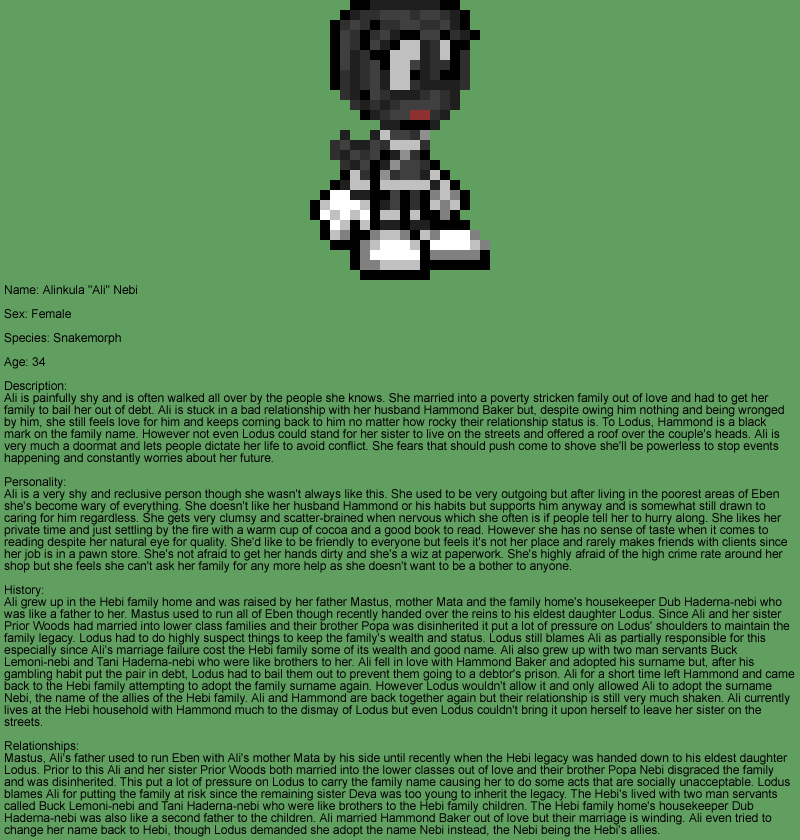 Ali married into an abusive relationship with a member of the lower classes. She came crawling back to Lodus who set Ali up with money and security but at the cost of a large sum of the Hebi family's wealth. Even though Lodus accepted Ali back she wouldn't allow her to have the family surname and gave her the name Nebi after the Hebi family's allies. The whole event made her into a nervous wreck that the family have deep concern for.