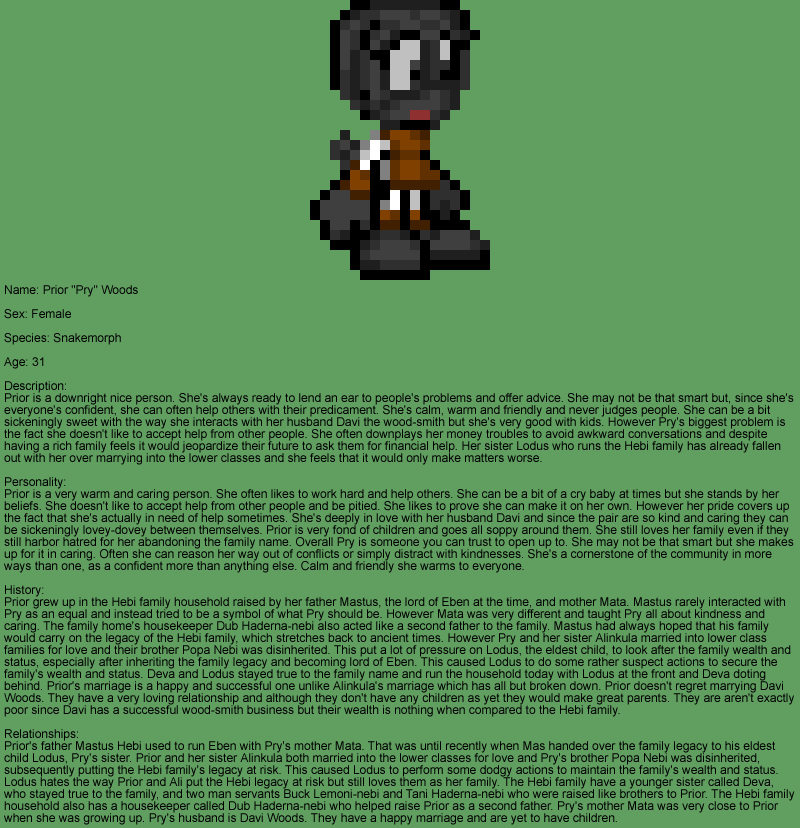Pry also married into the lower classes for love though unlike Ali found herself in a very loving relationship with a wood smith named Davi Woods. Pry is a cornerstone of the community in Eben and people come to her for advice. Pry is very short on money but keeps it to herself rather than troubling others by asking for help.