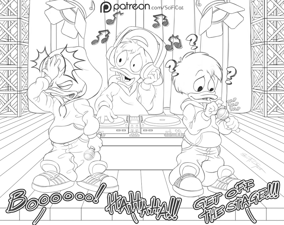 Commission for infexiouz-visionz of Huey, Dewey and Louie as a callback to the lesser know "Quack Pack" show produced by Disney on the late 90's Here the guys having absolutely rotten time on stage due to their inexperience. ;P