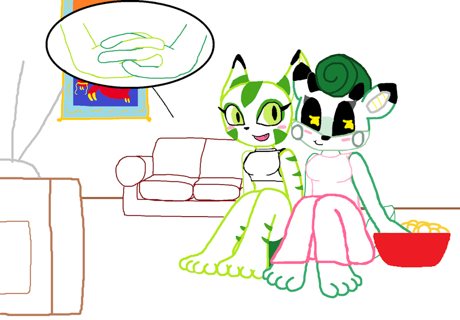 Here is my first crossover ship pic of some of my favorite sassy green gals, Cassia the pronghorn from the sonic Archie comics and Carol Tea or Carol the wild cat from Freedom planet. They’re just hanging out enjoying movies and eating snacks. And on a sleepover date. Bonding, laughing and getting flirty as the night rolls by. Maybe even share one kiss or many before the movie is done.