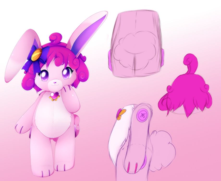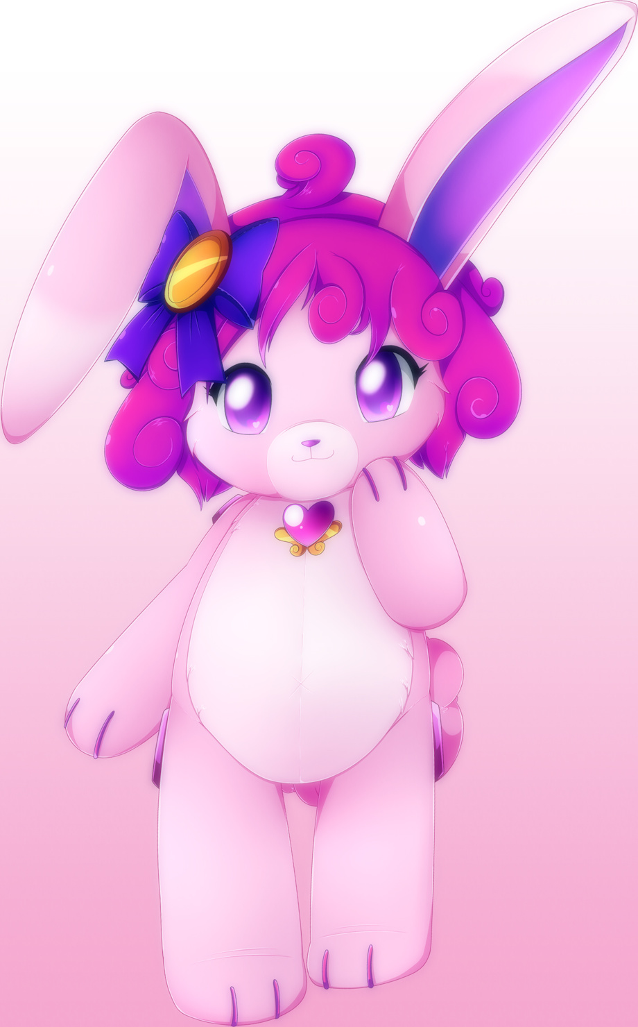 Her size is a big as a big plush toy, usually has pink and white fur similar to that of plush fabric. She has long ears with white tips and a fluffy tail. Her hair is colored dark pink, curled in some areas. Her chest has a jewel which housed her soul, like other plush beings in the world she's in.