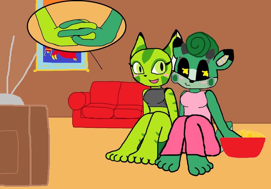 here is my first crossover ship pic of some of my favorite sassy green gals (NOW FULLY COLORED), Cassia the pronghorn from the sonic Archie comics and Carol Tea or Carol the wild cat from Freedom planet. They’re just hanging out enjoying movies and eating snacks. And on a sleepover date. Bonding, laughing and getting flirty as the night rolls by. Maybe even share one kiss or many before the movie is done.