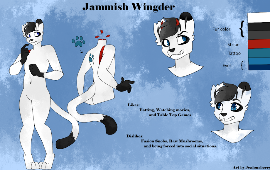 Mostly white. His paws,the tip of his ear(s) and the tip of his tail are black and though his hair is naturally silver he has dyed it black. He has a red stripe that is frequently mistaken for being a natural marking, despite it and the turquoise pawpad on his back being tattoos. The tip of his ear has been ripped off, but which one keeps being debated, as it seems to switch every so often.