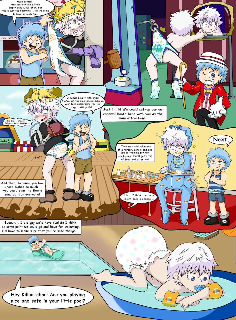 In a collaboration with the first commissioner, I was requested to continue the story of poor Killua here. Arryn, the blue haired younger tormentor, still has Killua in his chocolate ice-cream wedgie and begins to read off all the wonderful things he has planned for his newly captured plaything. From a carnival hammer game that'll give you a massive wedgie when you ding at the top to dancing in his underwear for a crowd to sitting in a high chair and being fed numerous bottles of milk and mushed food to being left in your diaper in a kiddy pool... he's got a lot planned.