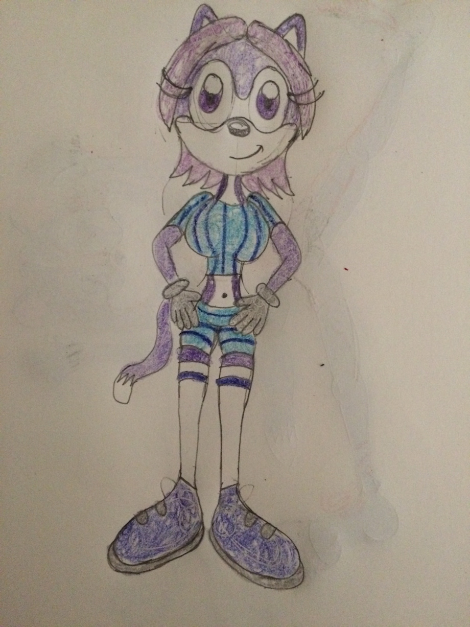 1. Her fur color is purple. 2. The hair on her head is lavender. 3. She wears a short sleeve t-shirt and a pair of shorts that are both sky blue with indigo stripes. 4. Her gloves are grey, as are the laces and soles of her hi-top sneakers. 5. Her sneakers are indigo. 6. She wears a pair of long socks with her sneakers.
