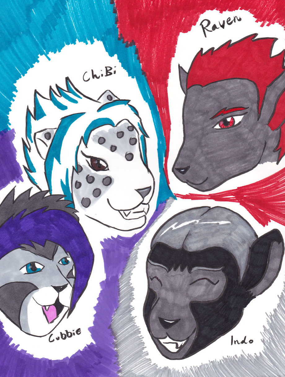 I started drawing this at 4am. I finished by 8am. My fursona's face looks a bit off, but whateves. I love how the other faces turned out.