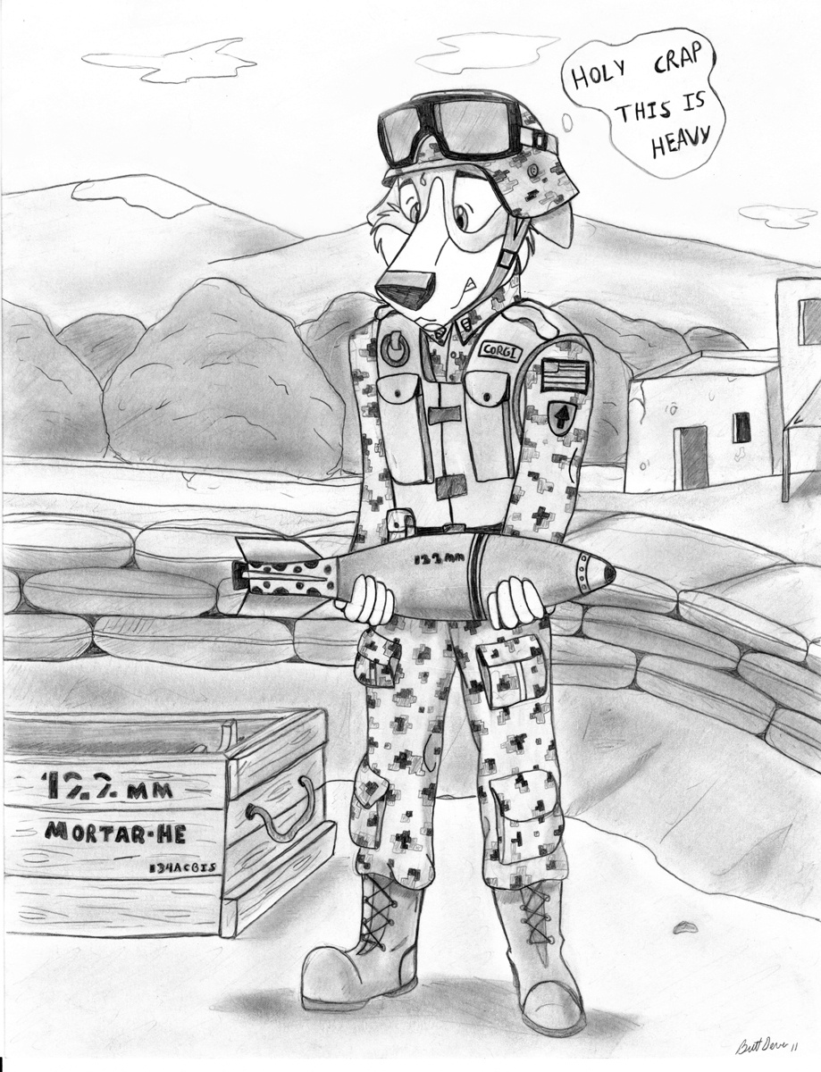 Just a pencil drawing of Corporal Corgi struggling with a mortar round.