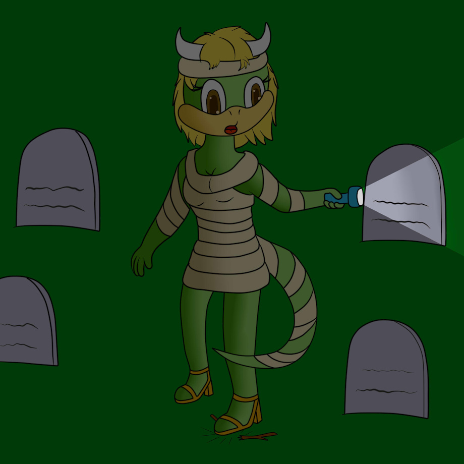 @HeattheDragon character heather trying to get to a costume party by cutting through a graveyard. she does make a cute mummy though