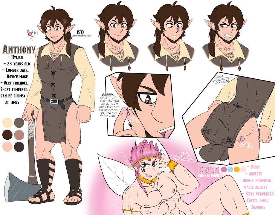 So if you guys remembered the last picture i uploaded with a reworked giant Anthony, after playing countless and countless hours of the new Zelda game BOTW, (Seriously has consumed my life......>>;;;;;) i wanted to do a reference sheet of him. Including another character being Anthony's own Fairy (Yes i know you don't actually get a Navi fairy in BOTW, but pink fairies do exist in the game and Link and capture them so SHUSH) Which his name is Devon. Hes a fairy prince and hes a massive perv. #Noregretsonmakinghim