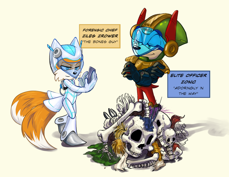 We decided he would be the Chief Forensic Scientist of Zonic’s precinct – a sharp witted and confident fox who worked his way up to the top of his field only to demand that he be left in sole control of the laboratory. No colleagues, no interns, no “little helpers”. They’d only make a mess of the place. He hates mess. Euch.