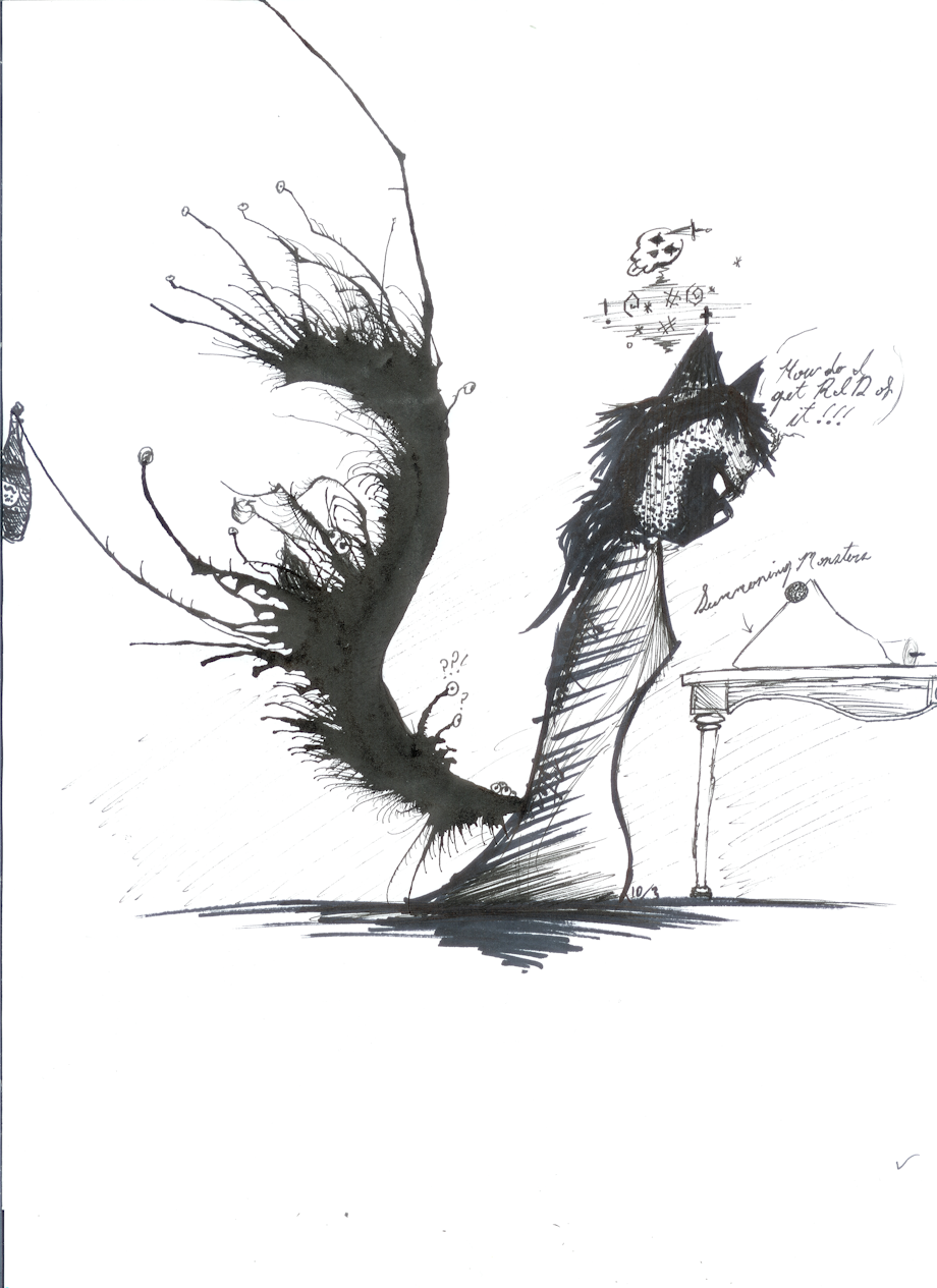 basically this is a 11 by 8.5 inch peice featuring a female siamess-like kitty who has summoned a goop-monster BUT... IT took the place of her tail and is now searching for tasty smelling things... And booze.