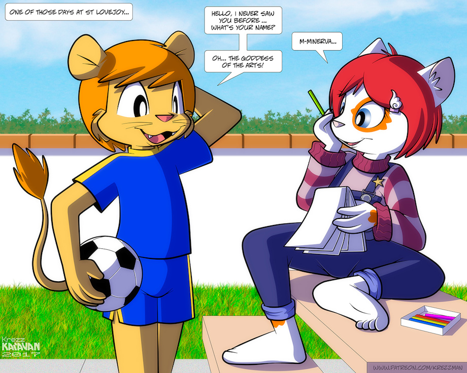 One day, Minerva by MoonlightTrance was about to do some nice sketches of St Lovejoy's sports area. Being an artist, she's shy and looks cute; but suddenly a soccer ball landed near the outdoor lunch area, and certain naughty lion cub, fetching the ball, noticed her sitting on a table. Another customized pic for