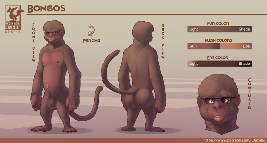 This is a Zootopia-style reference sheet for FalconClaw of his primitive version called Bongos.