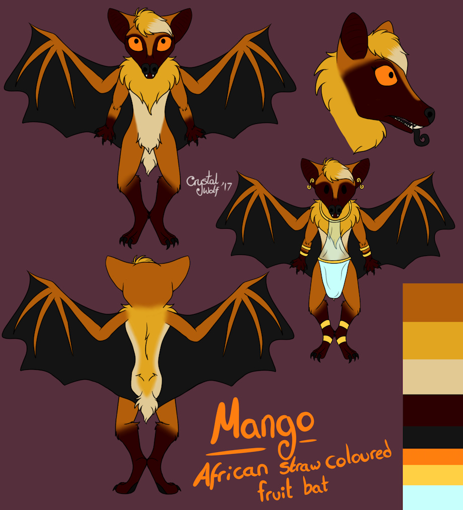Name: Mango Gender: Male (femboy) Species: African straw coloured fruit bat Appearance: Reference sheet pretty much explains everything but WINGS CAN BE SEPARATE (like pictured) OR FUSED WITH ARMS. Personality: (will update soon)