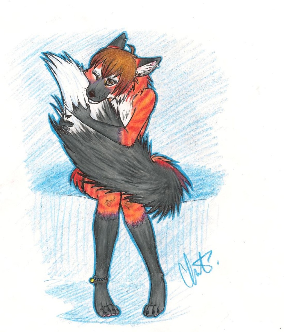 slender, bright fur, vivid oranges and reds, looong black tail with a white tip, typical fox markings on body, pink paw pads,choppy bangs, brown eyes, brown-blonde-red hair