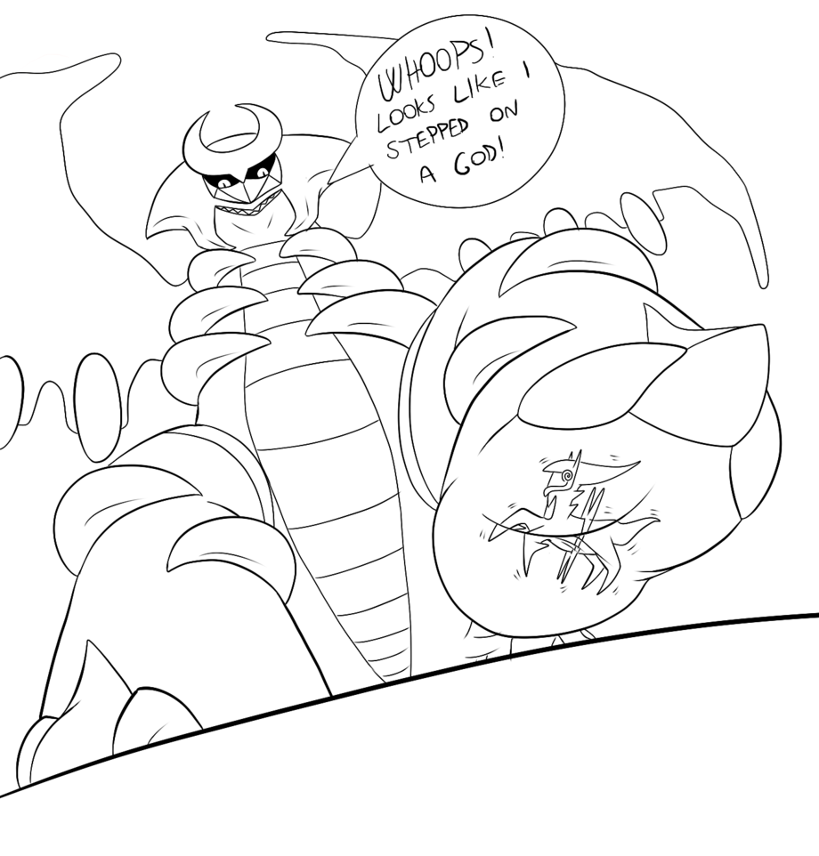 this was my first time drawing Giratina and a toony stomp X3 it came out better than I would've expected ^.^; anyway, here we have Shade the Giratina taking his revenge on his nemesis Arceus, stomping him flat like he deserves apparently ;3