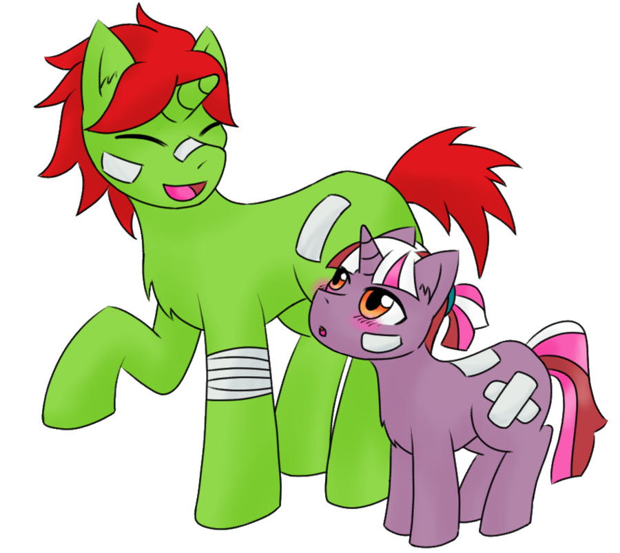 This is Hazy Sky and Green Tea's first meeting. Hazy had gotten into another fight and got so mad he used magic rather than his hooves. Aim too high, he ended up hitting Green Tea. He recovered soon afterward but rather than scolding Hazy, he complemented his skills despite his age. This had been the first time anyone save for his mother (Twilight though he never calls her that to her face). Green Tea offered to walk Hazy home, giving him fighting advice and offering to be his sparing partner from then on. Hazy has loved him ever since.