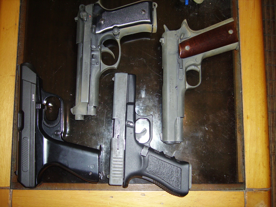 a VP70 (airsoft) a beretta M9 a glock 17 and a colt 1911 (last three blank firing replicas)