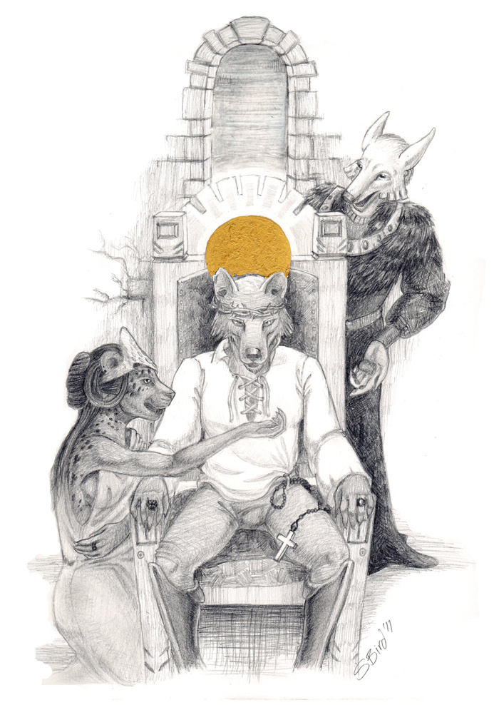 This particular image has been sitting in my head for a while now, and was originally inspired by the Lady Gaga song "Judas" and the famous series, "The Tudor," which I have been watching for two weeks in a row and have just finished. You can draw any meaning you like from it, but the main point of the piece is that a monarchy ruled by religion is truly a form of tyranny, and that sometimes, we can still see it today, even in our democratic government. You can interpret the Wolf as the King, the Leopard as the people, and the Jackal as the church. You could also interpret the wolf as Jesus, the leopard as Mary, and the jackal as Judas. It's really up to the viewer, since the piece is meant to represent many things than what I wrote above.