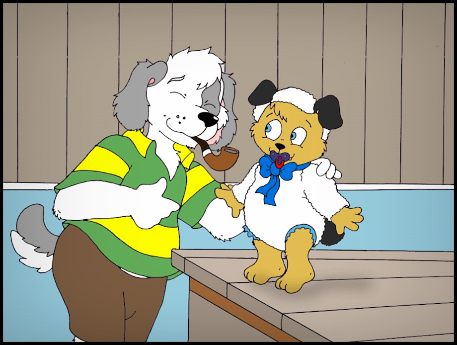 Today Kiba was going see his good buddy and one his favorite caretaker Barnaby Guthrie. Kiba was really happy one Mommy Luna drop him off.One he got there Barnaby had a surprise wolf pup.I have little outfit I like you to wear Little Kiba,said Barnaby with a Chuckle.Oh wha is dat,said Kiba. Barnaby pull out a Sheep outfit.It soo white and fluffy,Kiba giggles.Barnaby then dress him up outfit and give the pup a binky and blue ribbon as well.Well well well look what we got here "a wolf in sheep clothing" the Sheep dog said with a grin.Well don't you look adorable there Kiba with that outfit,said Barnaby.I say we have fun at the Park now ok. The two of them had a fun day at the park.