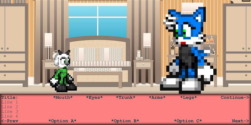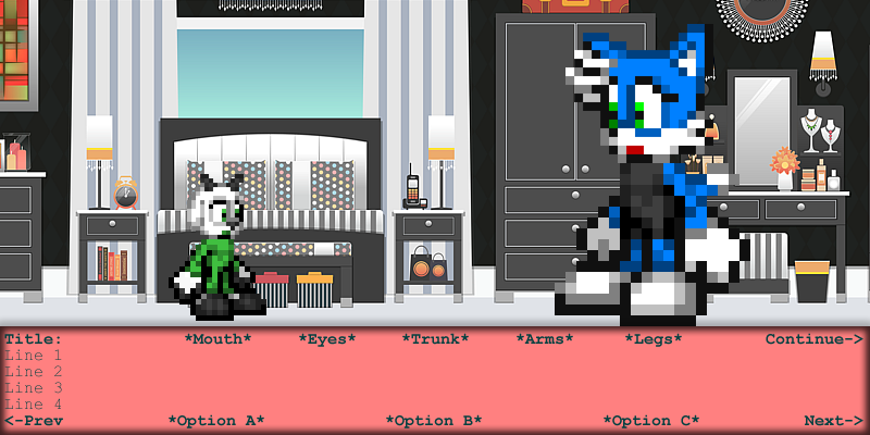 . Something similar planned for other locations. Images from top to bottom: Lounge, Kitchen, Bathroom and 2 Bedrooms, one will be the master bedroom and the other the guest bedroom but which is up to the player. Characters will now be standing above the dialogue box too so you don't miss any of the sexy action. Backdrop now pans left to right and up and down depending on where characters are on screen.