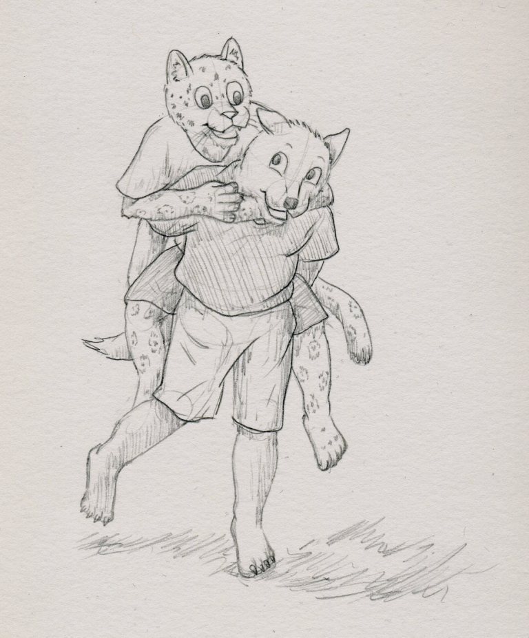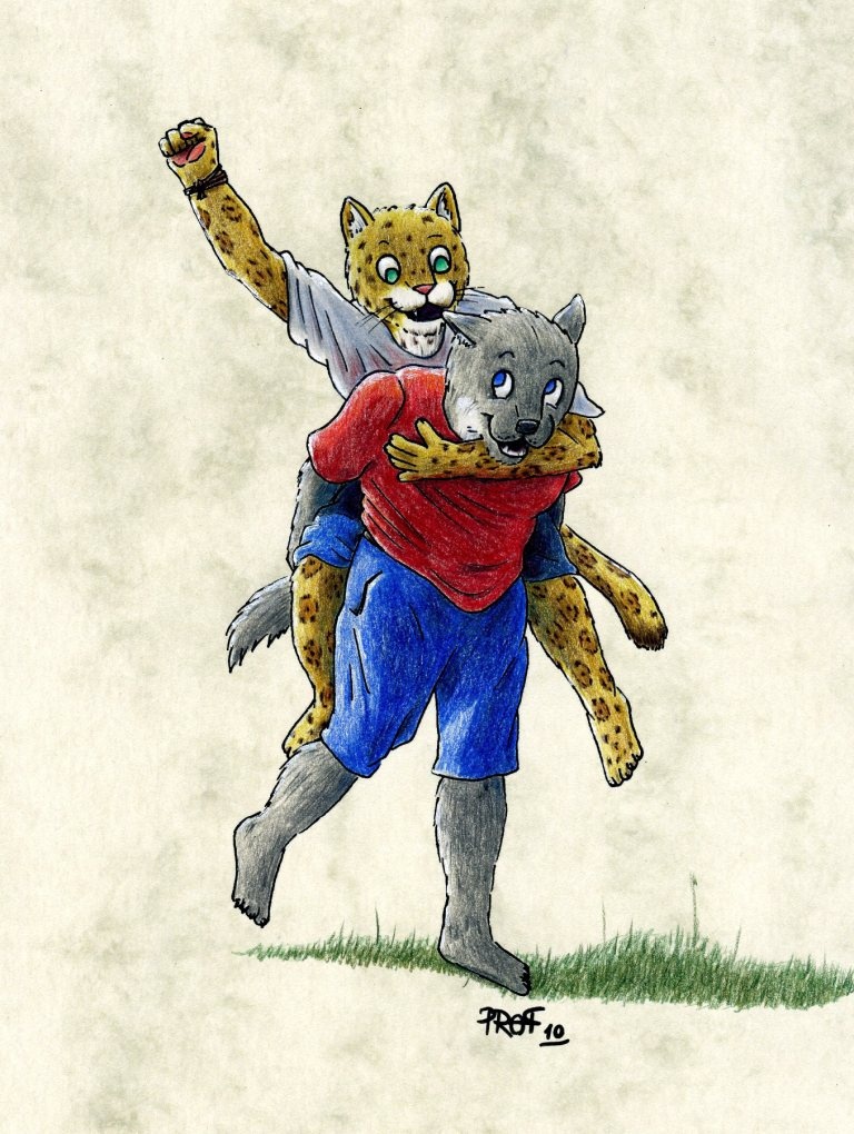 I’m not sure why the wolfie gives his jaguar friend a ride. Probably some sort of competition, and judging their looks, they're goona win it.