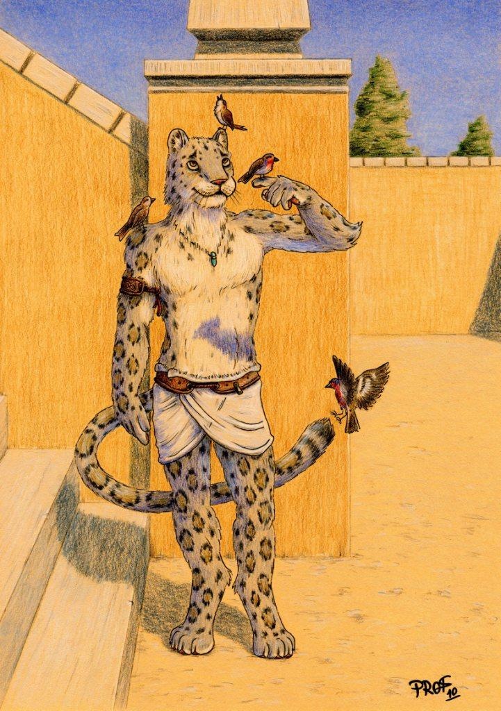 He was clad in a sleeve-less tunic and shorts, both garments had a dark green colour. A woven leather belt around his waist held several little bags, a knife and a short sword, his right paw not far away from the hilt. A quiver full of yellow-feathered arrows was strapped on his back and the appertaining bow, a remarkable weapon, as tall as its owner, leaned on a tree near him. And of course no footwear, not with such feet.