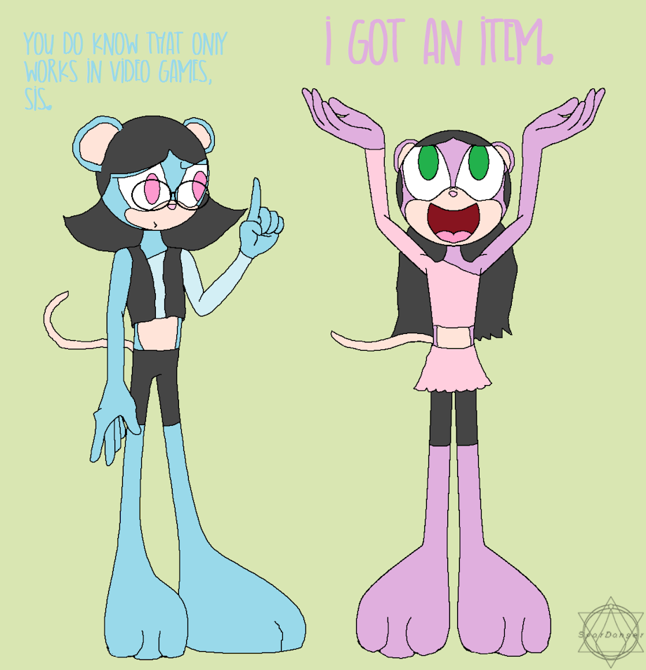 Cocoa (the blue one) is a more level headed of the twins and a daughter of Danny and Kashina. Cocoa isn't very much up for physical stuff being more comfortable with her muzzle buried in a book and is the smarter twin sister. She makes straight As in school