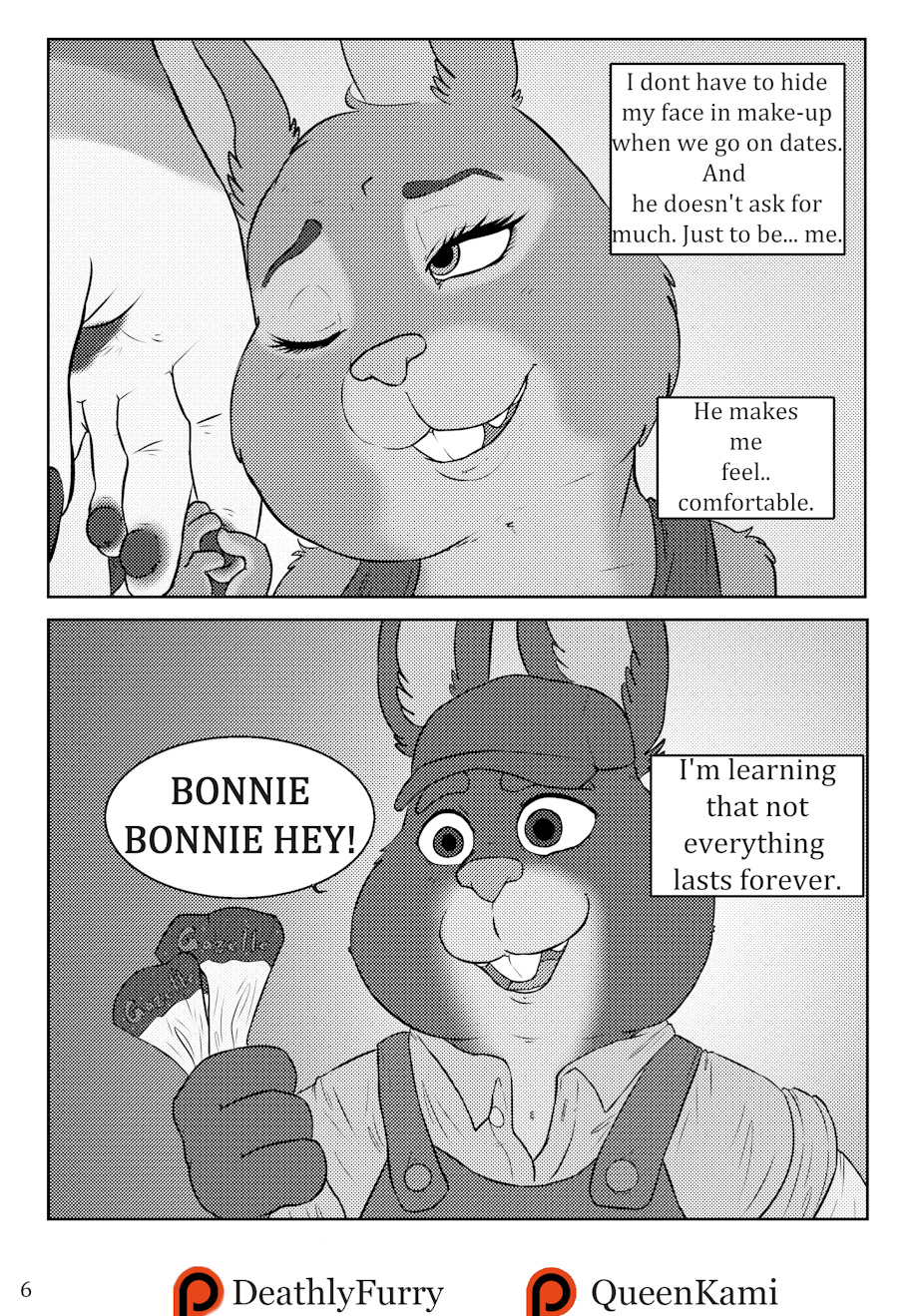 A Doujinshi Comic based upon the Disney Movie "Zootopia". This will take Place in Bunny Burrow for the most part between Stu Hopps, Bonnie Hopps, and Buckley LockJaw(My OC). ________________________________________________________________________________________ One summer in the hopps household the tv over heated and burned out needing repair. Mrs. Hopps called out for a repair man in the area but all the bunny repairmen were out and busy for the next month. The only available was Buckley LockJaw a Pitbull with pretty high ratings. Without any other options Bonnie had to send out the request for him. The Next day Buckley Came in with his tools and equipments. Stu was out at a farmers convention for the day and wouldn't be present. When Bonnie first laid eyes on him she first realized how tall and toned he was. He was about 2 times her size. She pointed him to her TV to work on and with that he went to work. When he passed her Her nose caught a whiff of Buckley. She could smell he was musky and dirty. The only reason she would notice unbothered is cause of her being in heat since the day before. It drove her wild with arousal and didn't have her husband to scratch her itch. She ignored it as best as possible as he worked. An hour passes and the work is done but the room reeks of his scent. She cursed herself for becoming aroused by his stench. She stops him after Paying him looking up to him with lustful eyes he could only loo down at her with his simple cheerful face as he sniffed the air picking up her scent. That night bonnie had cheated on her husband with another man but not only man but a predator at that. She was left sore from him stretching her out making a gaping hole for juices that left her legs numb. Her itch had been scratched like never before. After that day every night stu would do his best to please his wife but she was not getting off to him anymore she felt he was too small. At that point she knew what to do. She would begin to break stuff every other day to cause the repair man to come by to work on the problem and her. __________________________________________________________________________________ If u want a full resolution image and see the comic every week on time go to my patreon page HERE!!! Enjoy!