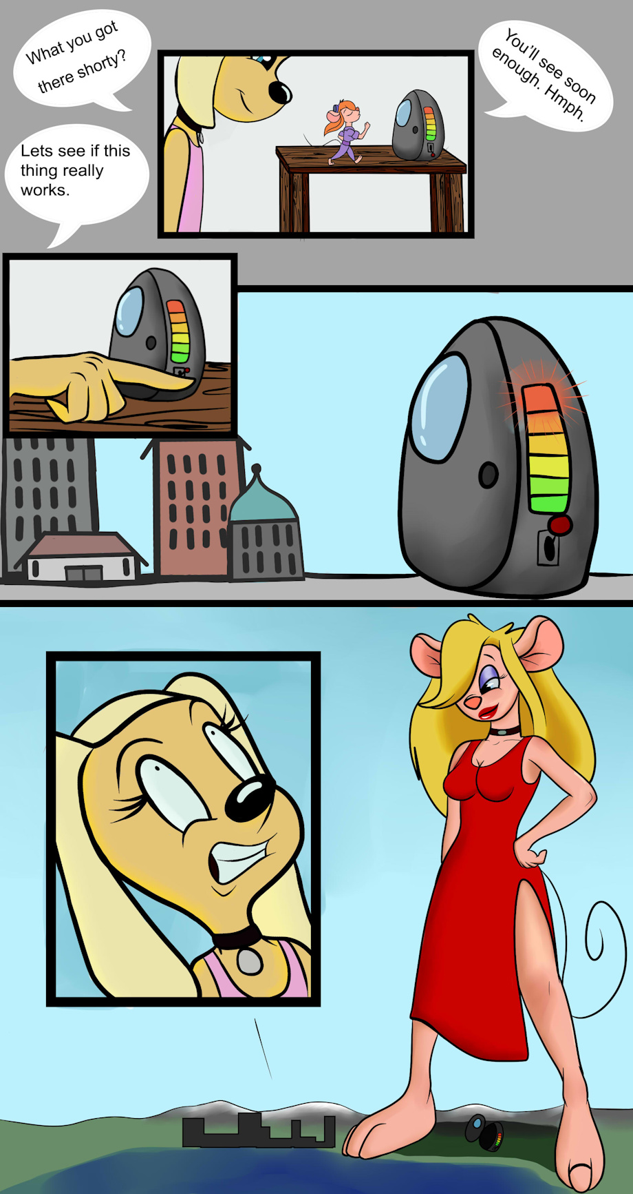 Another piece made for by Tigressheart (and posted here with her permission). Being sick of her roommate Brandy Harrington calling her short. Gadget created a pod to make her but while she is in it, Brandy decide to set to full power as prank. Which only not made Gadget bigger but sexier (like in a certain episode). To Brandy's horror Gadget is so huge that she is now mouse size (or even less) to her now. If you want email Tigressheart at TigressHeart123@gmail.com if you like her to do a commission for you. Please leave a like and comment.