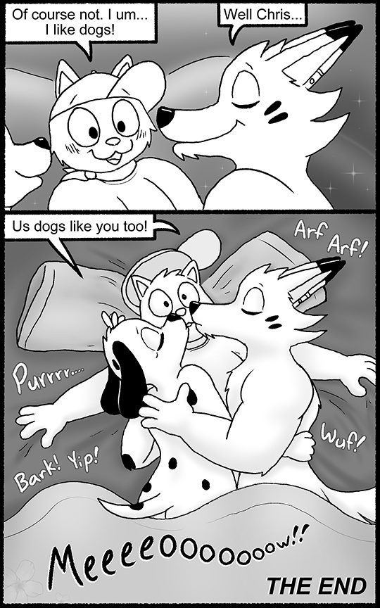 You did an awesome job with everything, Nishi! Thank you so much for sharing your comic makin' talents with us! :D I love the end here too, it's so super sweet. I'm glad Chris is gettin' to have his bedtime naked snuggles with his new special doggies. ^^ I hope you can keep on makin' comics and enjoying them lots. :)