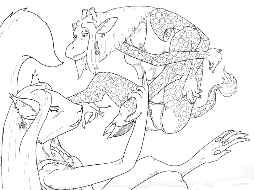 Or hoof painting, as the case may be. My cross-dresser Akkamui and my girlfriend's giraffe, Summer, getting all dolled up. I'm still settling the appearance of Summer, though... I'm going to go with the shorter neck and muzzle I had in the badge I did; less realistic but much cuter.