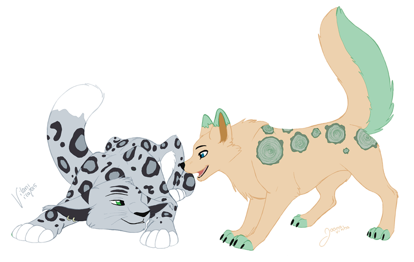 Mika is the snow leopard on the left, Tres is the wolf on the right.