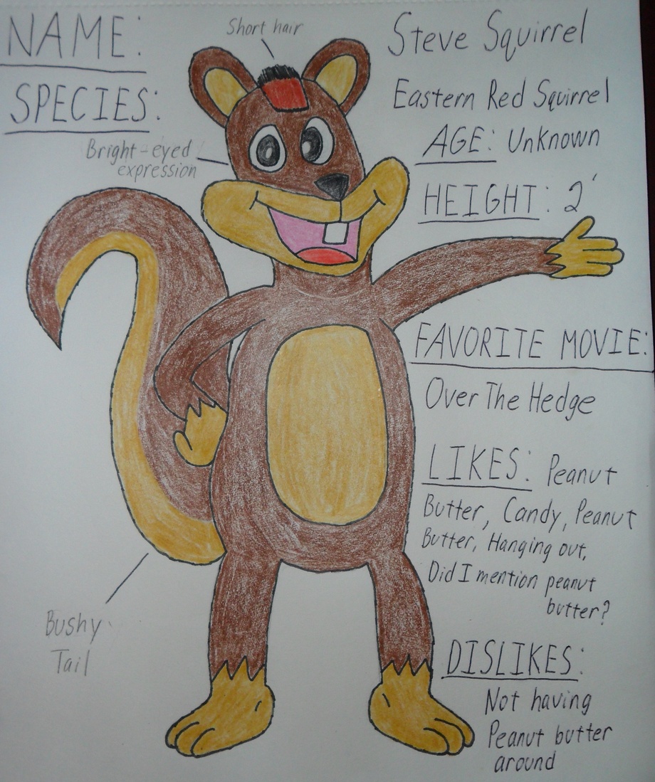 Background: Steve Squirrel is a mischievous yet lovable character. The gang doesn't know too much about him. He just showed up one day and never left. He likes being around the gang a lot. Steve is also obsessed with peanut butter. At times his addiction has gotten him in trouble. Mostly he gets stomach-aches from eating too much. He lives in a big tree in the backyard of the house where the gang lives.