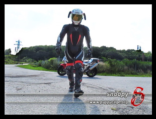 me in my Dainese Bora leathers, Shoei helmet with puppy ears, SIDI Race Corsa boots, and my Honda RC-51 (SP-1) in the background.