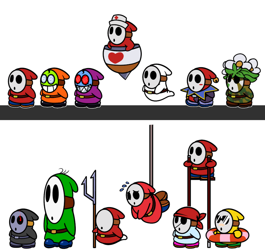 So everyone always draws "Shy Gals" but it's always the generic shy guy, but I've been playing Paper Mario 64 recently and I decided to draw a bunch of shy guys that Nintendo has neglected. I'm going to be doing more, but for now, enjoy.
