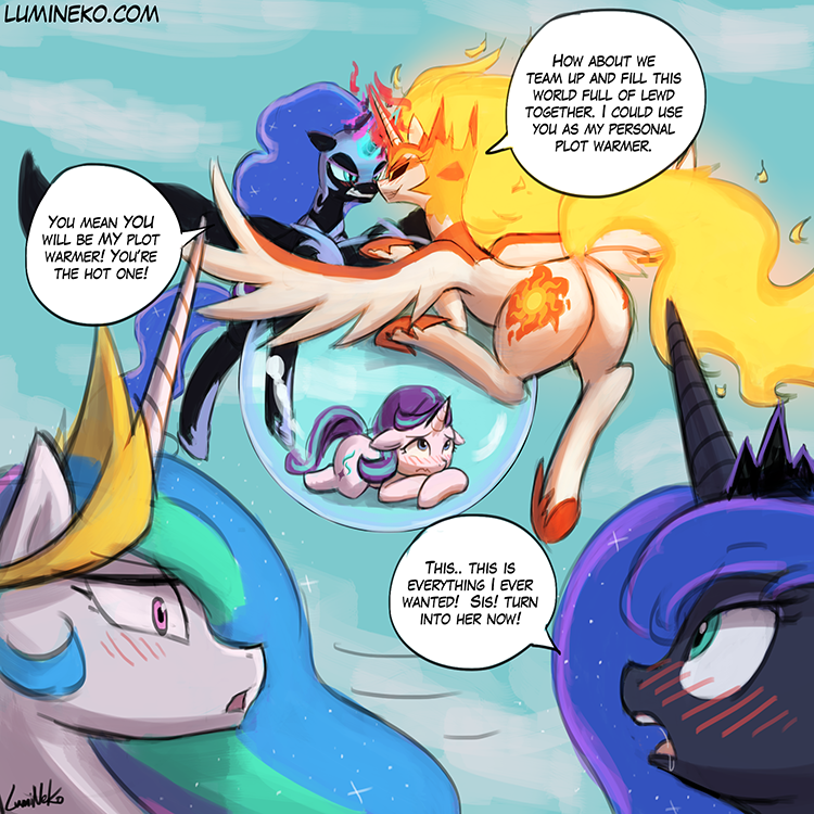 daybreaker several hours later: and so thats how i got the deliciously tantalizing figure you see before you "takes a sip of her drink as luna and celestia both take notes" honestly i never knew there were such a um.....interesting version of myself and my sister out there...such eager little things, touches my sun scorched heart really...and warms other things too.