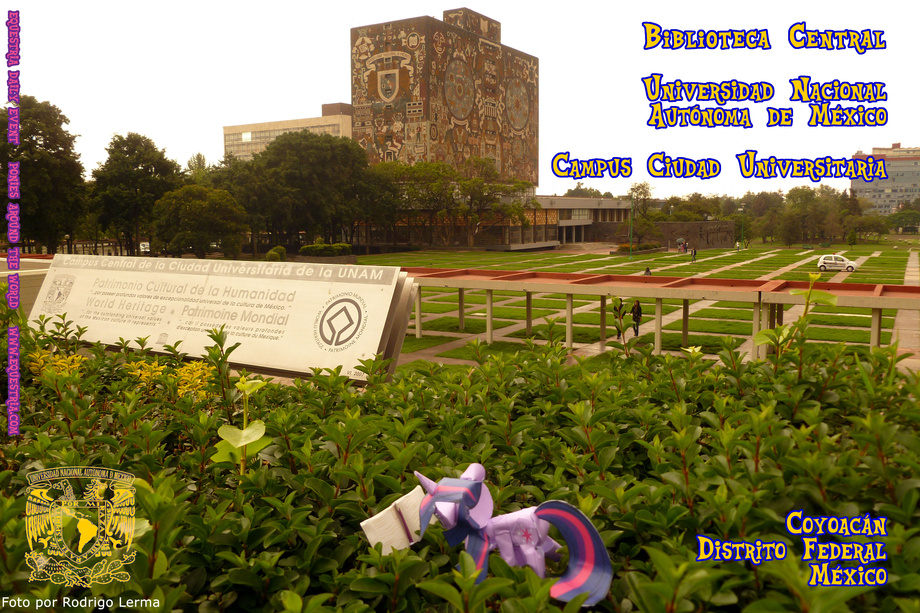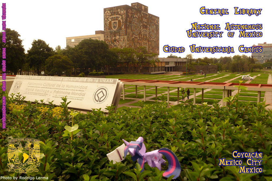 Versión en Español de mi entrada estilo My Little Postcard para el evento de EquestriaDaily "Ponies Around the World", aquí nuestra ñoña favorita disfrutando de un buen libro cerca de esa gran biblioteca que mi universidad tiene. Pony tontita XD <3