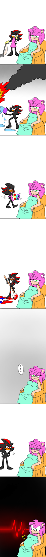 I love how Amy's pregnancy progresses with nearly every panel, that was a really adorable decision to make. And I think it's also sweet that Shadow took over the housekeeping for her. But what I love the most about this comic is Amy's face of absolute disdain as she gives totally no attention to the father of her baby as he sets the house on fire and possibly kills a Sonic Boom in the background, turning their home into a crime scene that the police just might have a field day with! And he does it all naked too! Evidence everywhere!