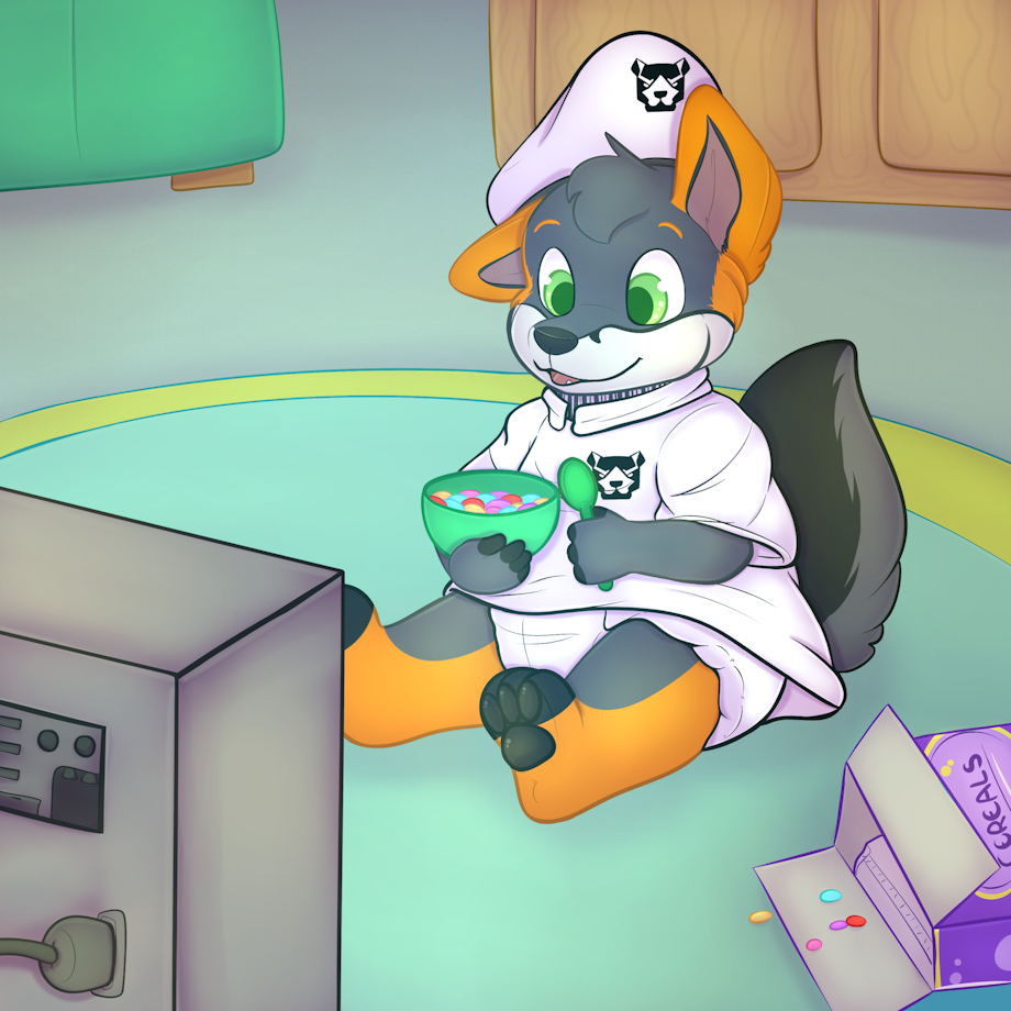 Felix the little fox is having fun watching the TV and eating a big bowl of cereals ^_^