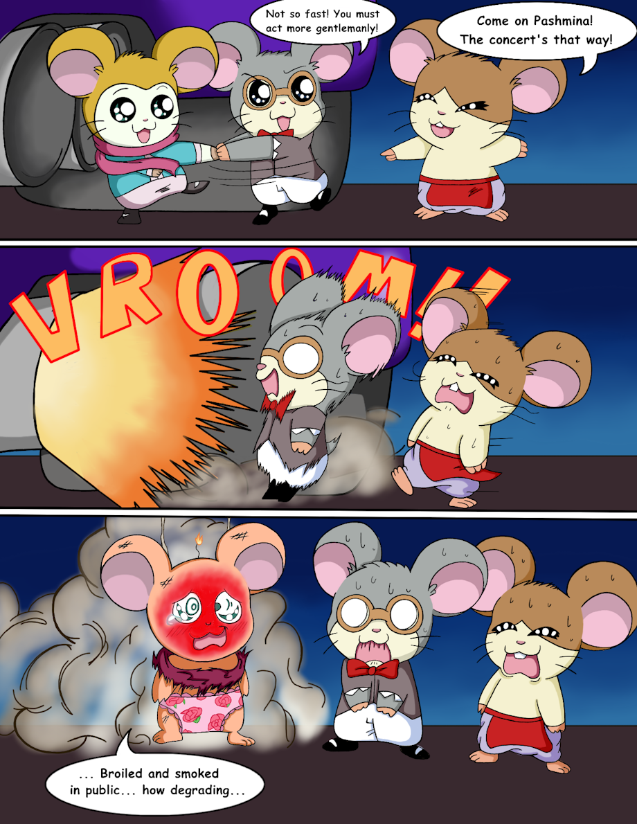 Meanwhile, Pashmina, Daxter, and Howdy are still on their way to the concert. They made the mistake of standing right behind a human car though. It turns on and blasts off, roasting the poor girl down to her panties. Ah well.