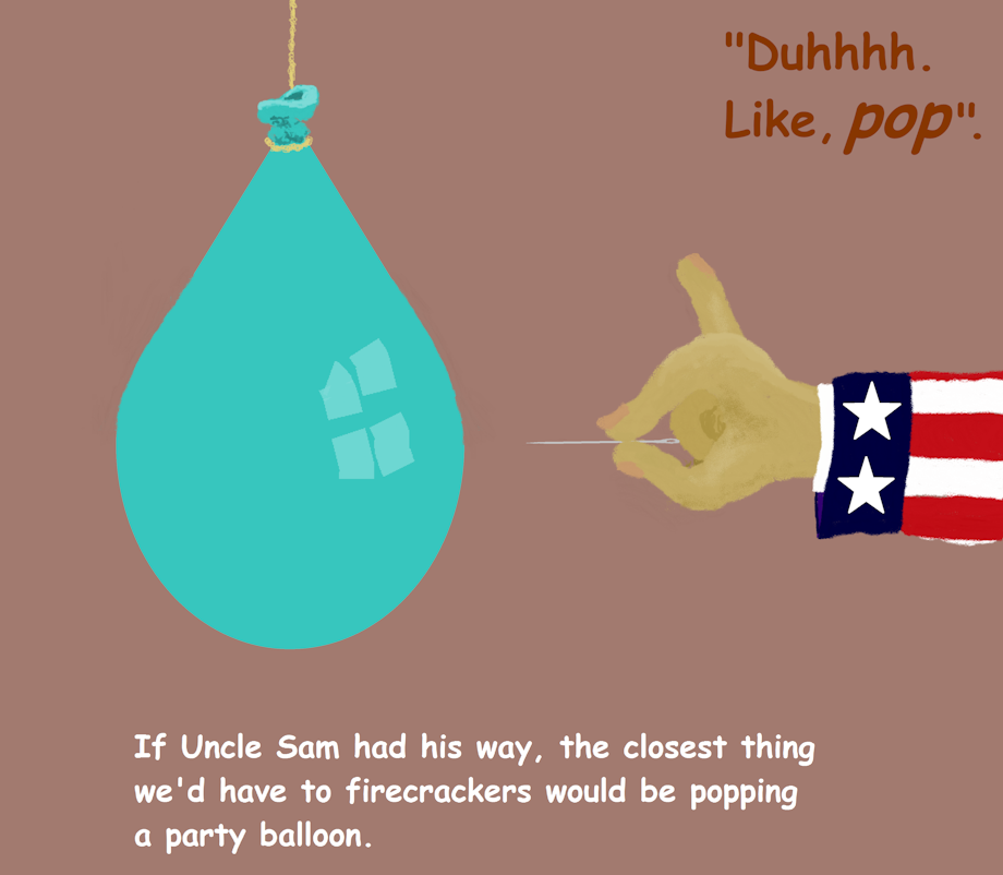Now, speaking personally, the only one of those I'm in favor of bans on is (certain types of) fireworks, primarily because they do have a habit of landing in the wrong place and starting house and brush fires. Firecrackers don't bother ME that much-- if someone is determined to shove one in their butt and light it, I hate that, but that's up to them, and they're the only one who'll get hurt. With bottle rockets, the shooter might be fine, but the family down the street may have their house burn down. This opinion applies only to those types which may, unknown to the user, drop a smoldering object somewhere.