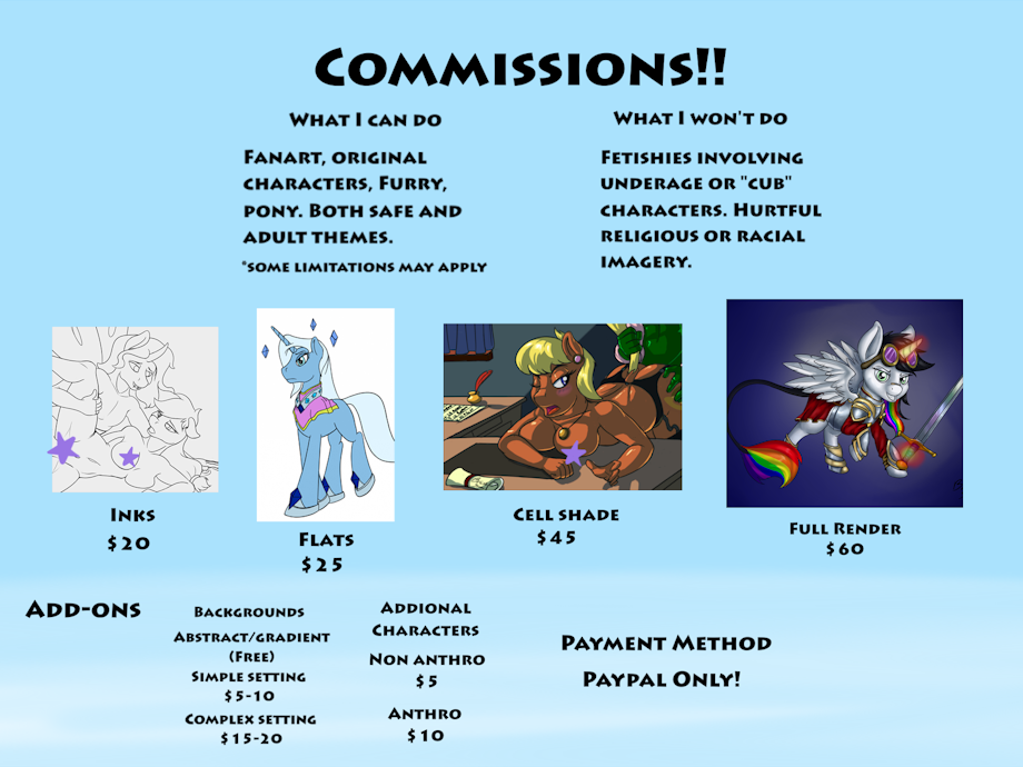 Payment in Paypal only. Work on the commission will be only after payment has been made in full. Please provide references for all OCs