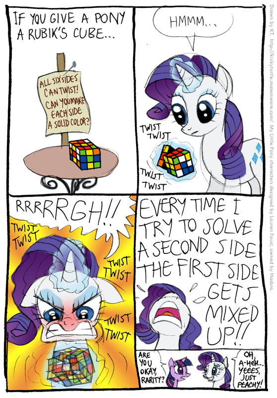 Just for fun, I decided to put a Rubik's cube on a table in Ponyville to see which of the ponies would be able to solve it. As you can see, some could, some couldn't... and some cheated.