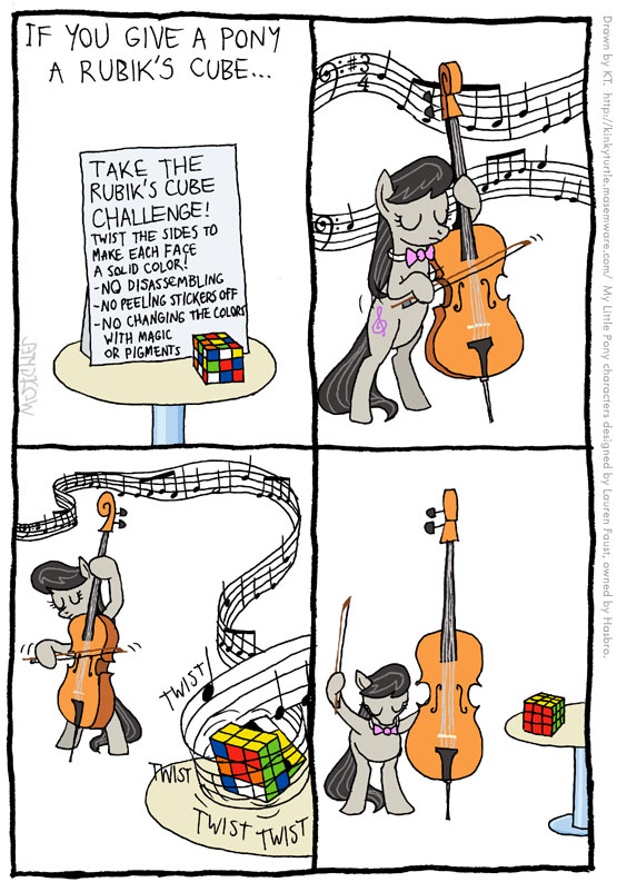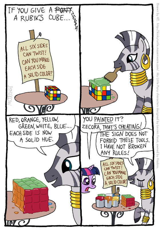 Just for fun, I decided to put a Rubik's cube on a table in Ponyville to see which of the ponies would be able to solve it. As you can see, some could, some couldn't... and some cheated.
