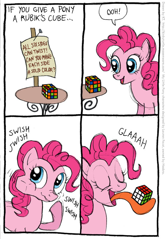 Just for fun, I decided to put a Rubik's cube on a table in Ponyville to see which of the ponies would be able to solve it. As you can see, some could, some couldn't... and some cheated.