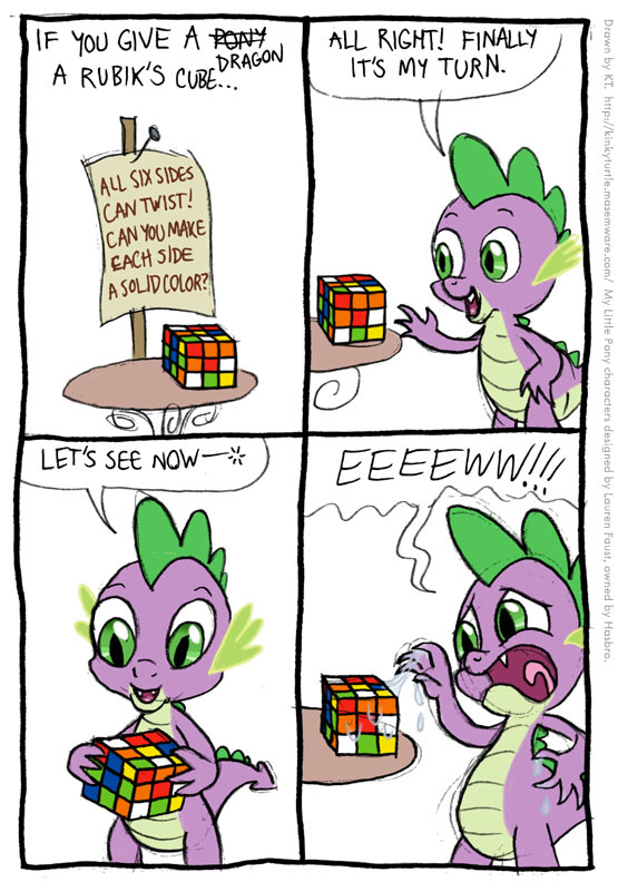 Just for fun, I decided to put a Rubik's cube on a table in Ponyville to see which of the ponies would be able to solve it. As you can see, some could, some couldn't... and some cheated.
