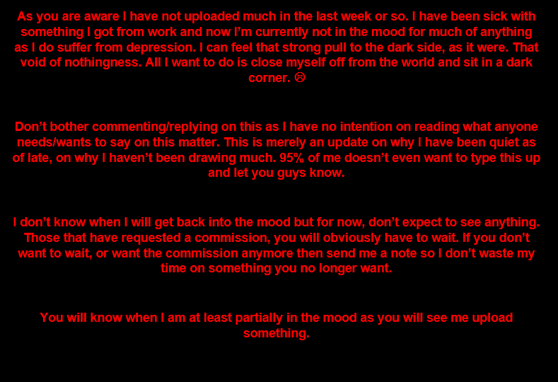 same, part of why it's taken me so long to complete the requests I had gotten on tumblr was due to a bout of depression and fatigue, which I am only just starting to get over, so I understand how you feel, even if you say you won't read these messages just know I fully understand needing to take time off